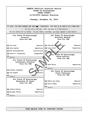 HomeLocalLeake County Sample General Election Ballot – November 5, 2019Leake County Sample General Election Ballot – November 5, 2019Mon, November 4, 2019 by Staff ReportSHARE NOW The 2019 election is scheduled for Tuesday, November 5. The Leake County Sample General Election Ballot for the November 5, 2019 General Election is available.