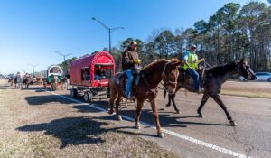 A wagon train from Philadelphia heads down Airport Road in Flowood toward the Mississippi State Fairgrounds in Jackson Friday for the opening of the Dixie National Rodeo tonight.