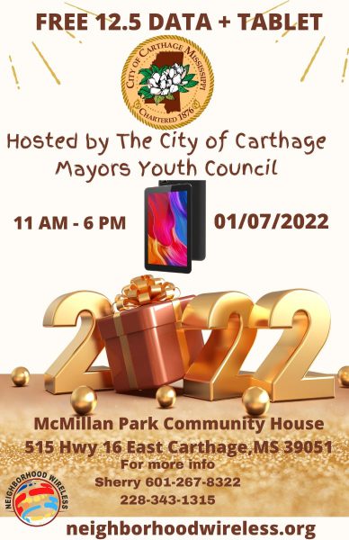 The city of Carthage is having a free tablet give away at McMillan Park in the Community House from 11am to 6 pm on Friday January 7th, 2022. The event was posted on Mayor Mary Ann Vivan’s Facebook Page, for more information on eligibility requirements, visit the mayor’s page on Facebook.