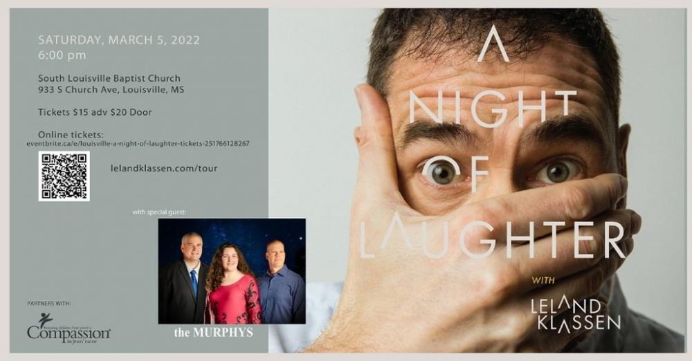 Christian comedian, Leland Klassen, will be performing live at South Louisville Baptist Church tomorrow. Doors open at 5pm and the show starts at 6pm. Leland Klassen has toured with Mark Lowrey and Chonda Pierce. Special musical guest for the night will be The Murphys (2021 Christian Servant Horizon Gospel Group of the year).