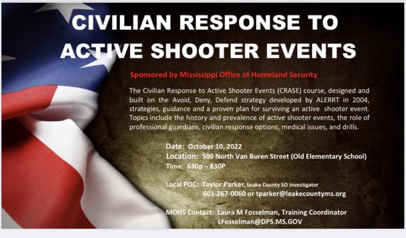 Leake County Sheriff’s Office is teaming up with Mississippi Office of Homeland Security to host Civilian Response to Active Shooter Events (CRASE) class that is open to the public and free to attend.