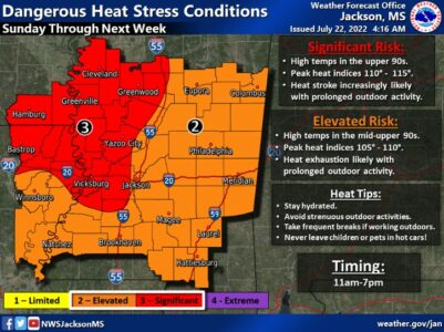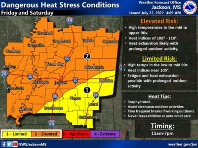 Last night’s storms didn’t do much to ease the heat stress in Mississippi. Most of the state including the local area will be under a heat advisory today with the heat index reaching 105 to 110 degrees this afternoon. And the heat wave is forecast to continue into next week. Several severe thunderstorms swept through this part of central Mississippi last night, but no significant damage has been reported.