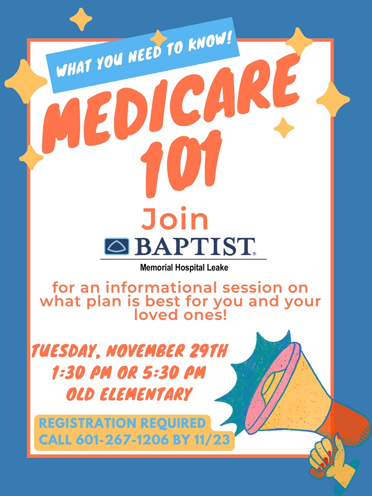 HomeLeakeToday in Carthage: Baptist-Leake hosts “Medicare 101” Informational SessionToday in Carthage: Baptist-Leake hosts “Medicare 101” Informational SessionTue, November 29, 2022 by Ashlee DavisSHARE NOW Baptist Memorial Hospital Leake invites the public to an informational session called Medicare 101.This will take place at the Old Elementary in Carthage today, November 29th at 1:30 pm and 5:30 pm.