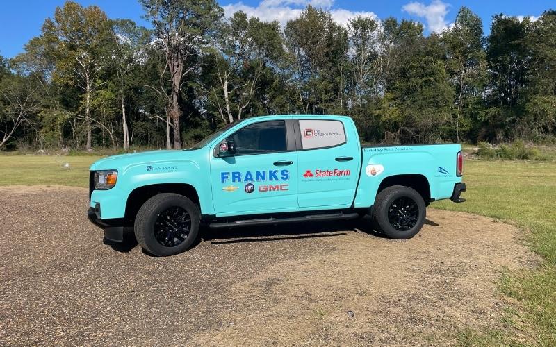 The vehicle, a bright blue GMC Canyon provided by Franks Chevrolet in Kosciusko, is pictured below.