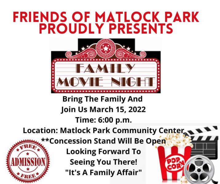 There will be a movie night at the Matlock Park Community Center Tuesday March 15th at 6pm. Friends of Matlock Park invites you to this family movie night event. The concession stand will be open and available. Admission is free.