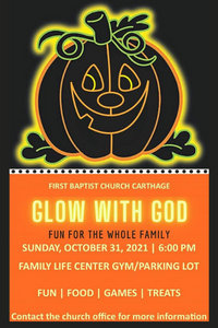 First Baptist Church of Carthage located on North Van Buren Street is hosting a Glow with God Fall Festival. It will be held on Sunday October 31st at 6pm in their Family Life Center Gym & in the parking lot. There will be food, games, treats, and lots of fun for the whole family!