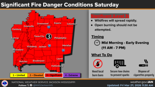 Almost all of Mississippi will be under a Red Flag Warning on Saturday as the danger of wildfires increases. The National Weather Service says gusty winds, low humidity and dry conditions will combine to create the dangerous situation. The warning will be in effect from 11 am until 7 pm.