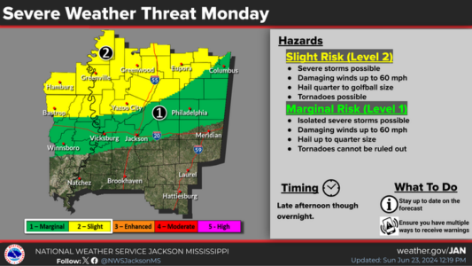 We’re approaching what historically has been the most dangerous time in the most dangerous month of spring storm season. But April has been mostly quiet in Mississippi this year. That’s about to change. Eric Carpenter at the National Weather Service in Jackson says the risk for severe storms in the local area Friday night has been upgraded to a Level-2 “slight” risk. But he says, that could be just the beginning…