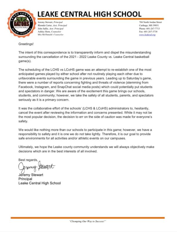 “The scheduling of the Leake Central and Leake County game was an attempt to re-establish one of the most anticipated games played by either school after not routinely playing each other due to unfavorable events surrounding the games in previous years. Leading up to Saturday’s game, there were a number of reports concerning fighting and threats of violence (stemming from Facebook, Instagram, and SnapChat social media posts) which could potentially put students and spectators in danger”