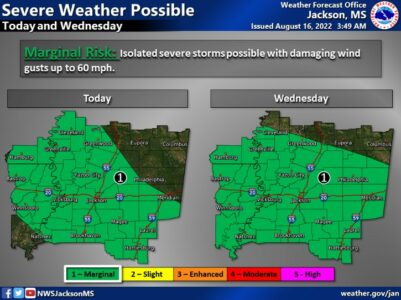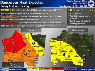 The National Weather Service is putting Leake County back under a heat advisory today with the heat index climbing as high as 110 this afternoon. The dangerous heat stress will extend to the south and west with the Delta under an excessive heat warning for heat indices approaching 115. There’s also a marginal risk of severe thunderstorms today across parts of the local area with the storm threat more widespread on Wednesday.