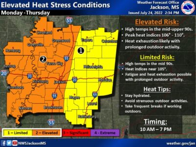 Much of Mississippi will begin the new work week under a heat advisory. The National Weather Service says the worst of the heat stress will be along and west of I-55 and north of Highway 82 through Thursday with heat index readings between 106 and 110 degrees. East of 55 and south of 82, the heat index could climb to 105.