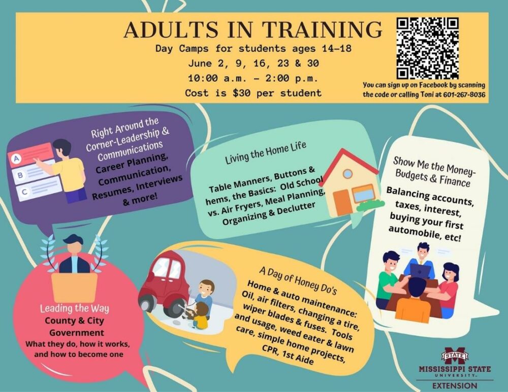 The Leake County Extension Service is hosting an “Adults in Training” day-camp. These camps will be every Thursday in June beginning on June 2nd and are open to youths, ages 14-18. The cost is $30 per participant.