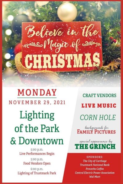 The City of Carthage will “Light up the Park” November 29th. The event kicks off at Trustmark Park at 5pm.