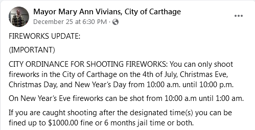 According to the Mayor Mary Ann Vivians, City of Carthage Facebook page, if you are caught shooting fireworks after the designated times, you can receive a fine up to $1,000, 6 months jail time, or both.