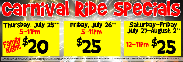 Starting Friday, it will be $20 for a day pass or $50 for a season pass plus $25 for a wristband if you want to ride midway rides. Children 9 and under get in free.