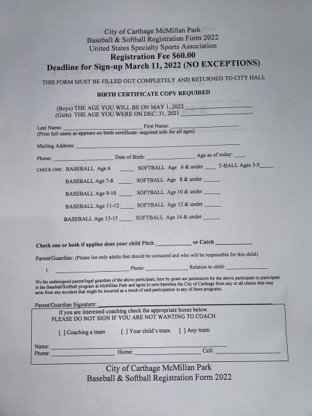 Registration for 2022 Spring season McMillan Park ball in Carthage is open. The deadline to register for t-ball, softball, and baseball is March 11th. The fee is $60 and can be paid at City Hall during regular business hours. (Registration form pictured below)