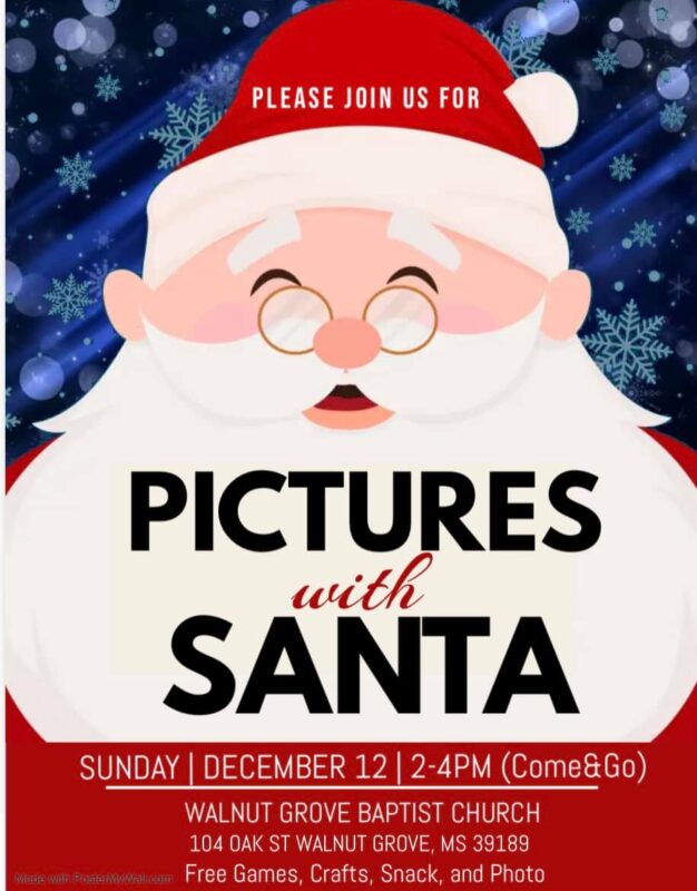 Santa will be at Walnut Grove Baptist Church on Sunday December 12th from 2pm – 4 pm. It will be in the Family Life Center of the church located at 104 Oak Street in Walnut Grove.