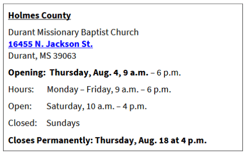 To assist those affected by the disaster, the SBA will open a Disaster Loan Outreach Center at Durant Missionary Baptist Church from Thursday August 4th through Thursday August 18th.