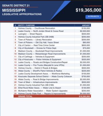 State Senator Bradford Blackmon (D-District 21) announced that during the 2026 Mississippi Legislative Session, $19,365,000 in state appropriations was secured for 24 critical projects across Senate District 21.