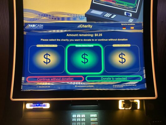 When guests “cash out” at a gaming machine, they receive a winnings ticket. They can take this ticket to a FABI kiosk to redeem for cash. Instead of receiving the loose change, they now have the option to donate it. Kiosks at all three properties have this donation option from a total of 26 kiosks.