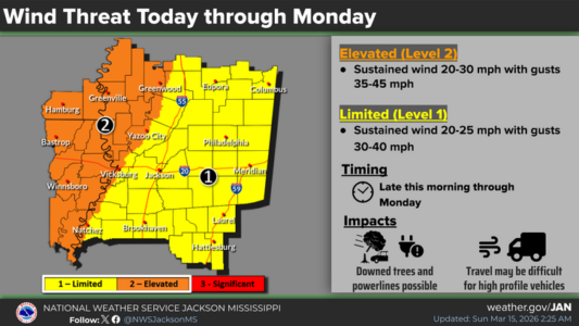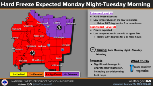 This part of central Mississippi will be under a Level-3 “enhanced” risk of severe storms tonight with damaging winds up to 70 miles an hour, hail and tornadoes possible. The storms are expected to move through quickly after 8 pm. Ahead of the storms today, gusty southerly winds are forecast with sustained winds up to 25 miles an hour and gusts to 40. After the storms, the winds will turn around and become northerly through Monday. A wind advisory will be in effect. Some snow showers will be possible in parts of central Mississippi Monday morning. Monday night, temperatures will plummet with most of the local area facing a Level-4 “extreme” hard freeze with lows in the low to mid 20s.