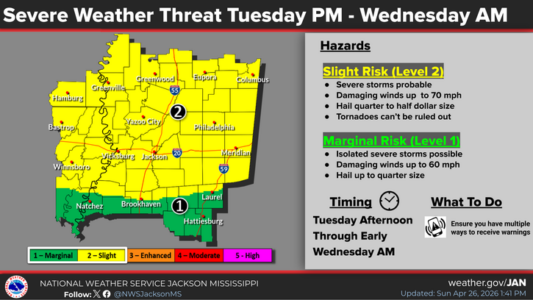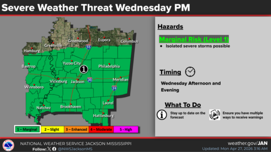 After weekend storms left behind some scattered damage across central Mississippi, more rough weather is expected this week.  Parts of the local area, including Attala, Holmes, Carroll, Montgomery, Choctaw and Winston counties, are under a Level-1 “marginal” risk of isolated severe storms today and tonight with damaging winds and hail possible.  Tuesday, stronger storms are in the forecast with the entire area under a Level-2 “slight” risk of severe storms. Tornadoes can’t be ruled out.  Wednesday, much of the local area will drop back to a Level-1 risk of isolated severe storms.