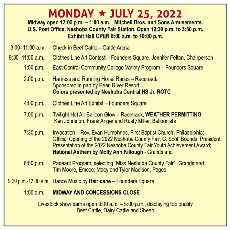 8:00 p.m. – The Pageant Program to select “Miss Neshoba County Fair” will be at the Grandstand