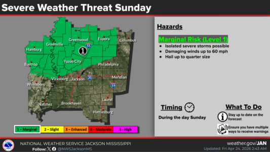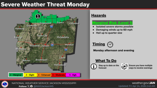 The National Weather Service says, while straight-line wind damage and hail will continue to be the primary threats, it’s not ruling out the risk of a brief tornado from severe storms which are possible in the local area and other parts of Mississippi this afternoon and tonight. Most of the state is under a Level-2 “slight” risk of severe weather. Wind gusts up to 60 miles an hour are possible.
