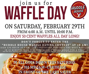 Join Boswell Media For Waffle Day at the Carthage Huddle House tomorrow from 6 AM ‘til 10PM. Enjoy 50 cent waffles all day long and enter the “Huddle House Waffle Eating Contest” at 10 am! Sign ups begin at 9 am. The contestant who eats the most waffles in 10 minutes will win Free Huddle House Meals for a Year! One free meal per week for 52 weeks. Lisa Moore and LOLLYDUDE will be live on Crusin98 from 9-11 and live on Kicks96 11-1