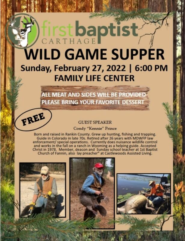 First Baptist Church of Carthage is holding their Wild Game Supper today at 6 pm. It will be in the Family Life Center. All meat and sides will be provided, just bring your favorite dessert. The guest speaker for this event will be Condy “Kennie” Price. Prince was born and raised in Rankin county and was with MS Department of Wildlife, Fisheries, and Parks for 26 years. The Wild Game Supper is free to all who wish to attend.