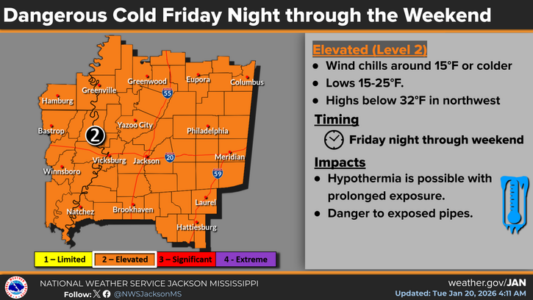 Extremely cold temperatures will be in place this weekend and some areas may stay below freezing continuously from Friday night through Sunday night. The coldest readings are forecast for Sunday night– 10 degrees in Kosciusko and Durant, 10 to 15 in Carthage and 15 in Philadelphia.