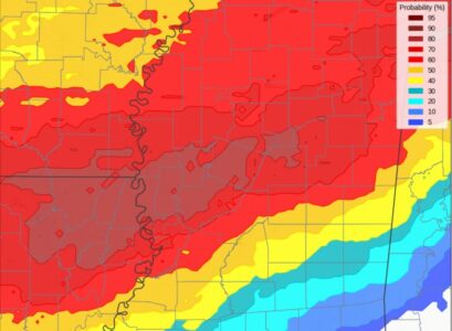 At this point, NWS projections suggest that both the Kosciusko and Philadelphia areas have a 58 per cent chance of getting more than a quarter-inch of ice accumulation with Kosciusko having a 41 per cent chance of getting more than a half-inch of ice. Kosy is given a 28 per cent chance of seeing more than an inch of snow and a 22 per cent chance of more than two inches.