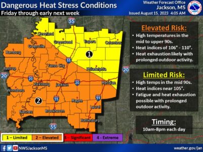 Finally a break in the heat wave. A cold front is pushing across Mississippi today and is forecast to push high temperatures down into the upper 80s with lows in the lower 60s. That’s actually close to normal for mid-August. But it’s been so long since we’ve had normal temperatures. The National Weather Service says enjoy it while it lasts. The heat returns this weekend.